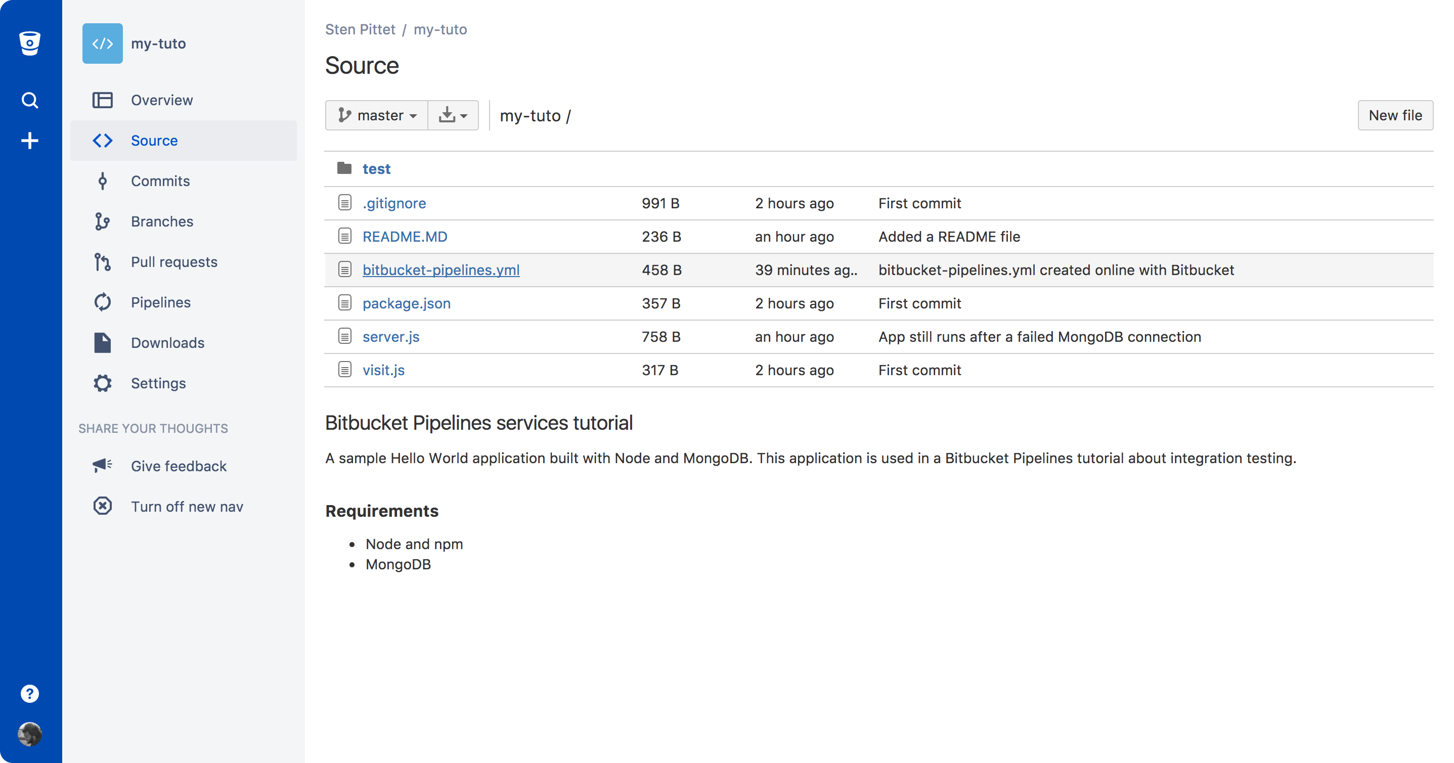 git clone git@bitbucket.org:spittet/bitbucket-pipelines-services-tutorial.git Ahora, ve a tu repositorio local y ejecuta npm install para instalar las dependencias que requiere la aplicación.