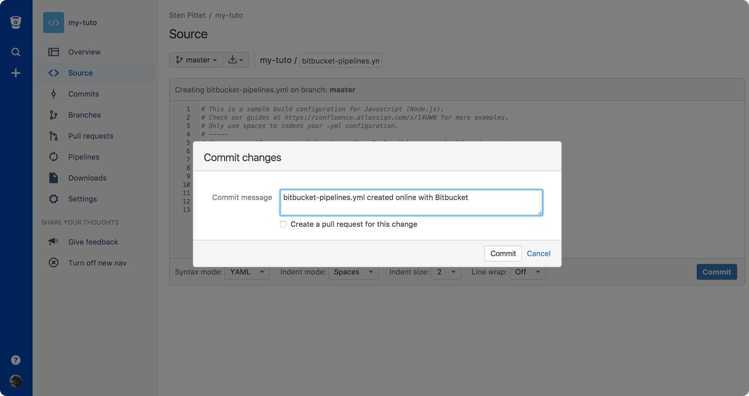Haz clic en el archivo de configuración bitbucket-pipelines.yml para acceder a él. Verás un botón de edición en la esquina superior derecha con el que podrás editar el archivo y confirmar directamente desde el navegador.