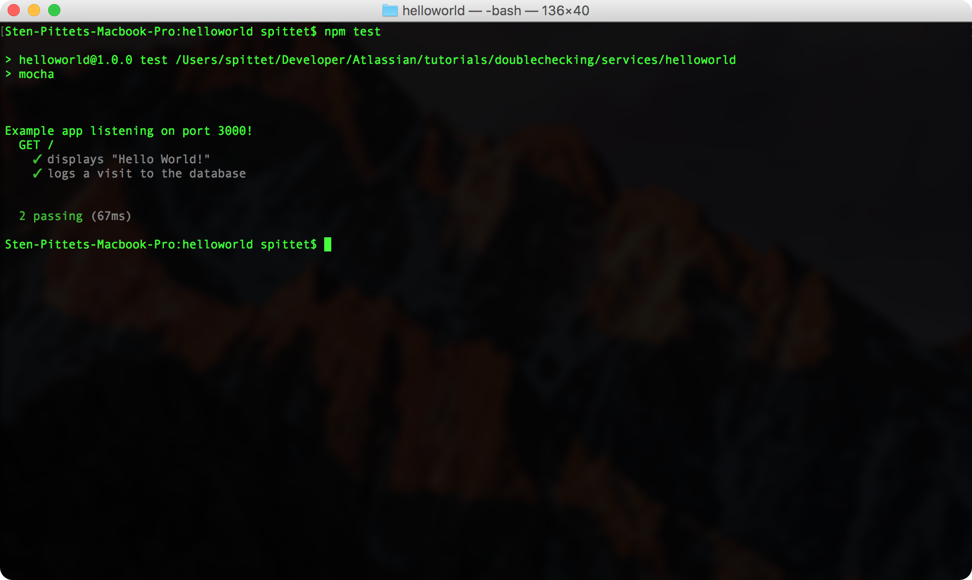 Finalmente, asegurémonos de que las pruebas se están realizando satisfactoriamente de forma local mediante la prueba de comando npm. Verás dos pruebas completadas tras ejecutar ese comando.