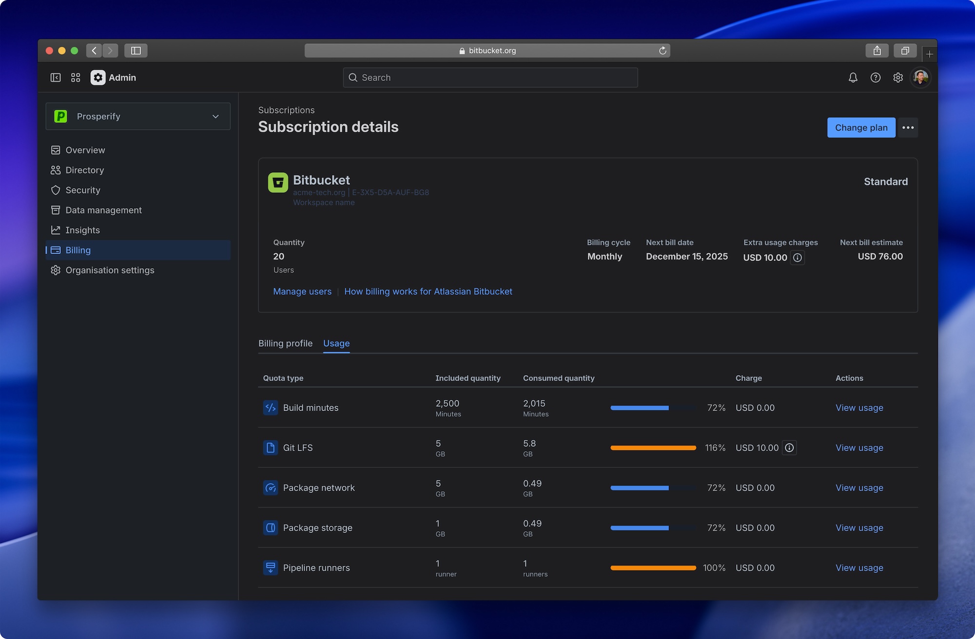 Monitoring usage: If you are the billing administrator, you can track costs and usage for all Bitbucket features, including Packages, via the “Billing management” option in the Settings menu in Atlassian Admin.