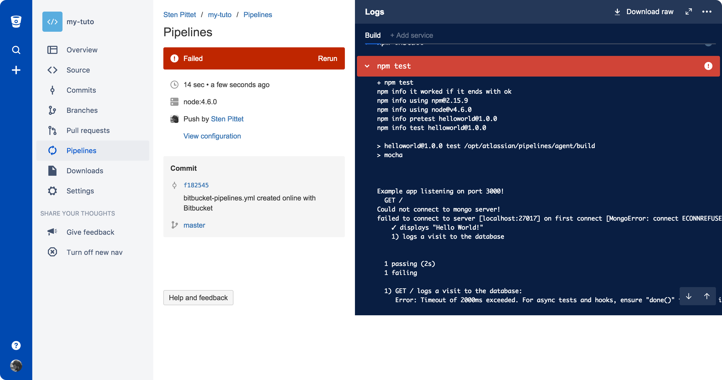 git clone git@bitbucket.org:spittet/bitbucket-pipelines-services-tutorial.git Ahora, ve a tu repositorio local y ejecuta npm install para instalar las dependencias que requiere la aplicación.