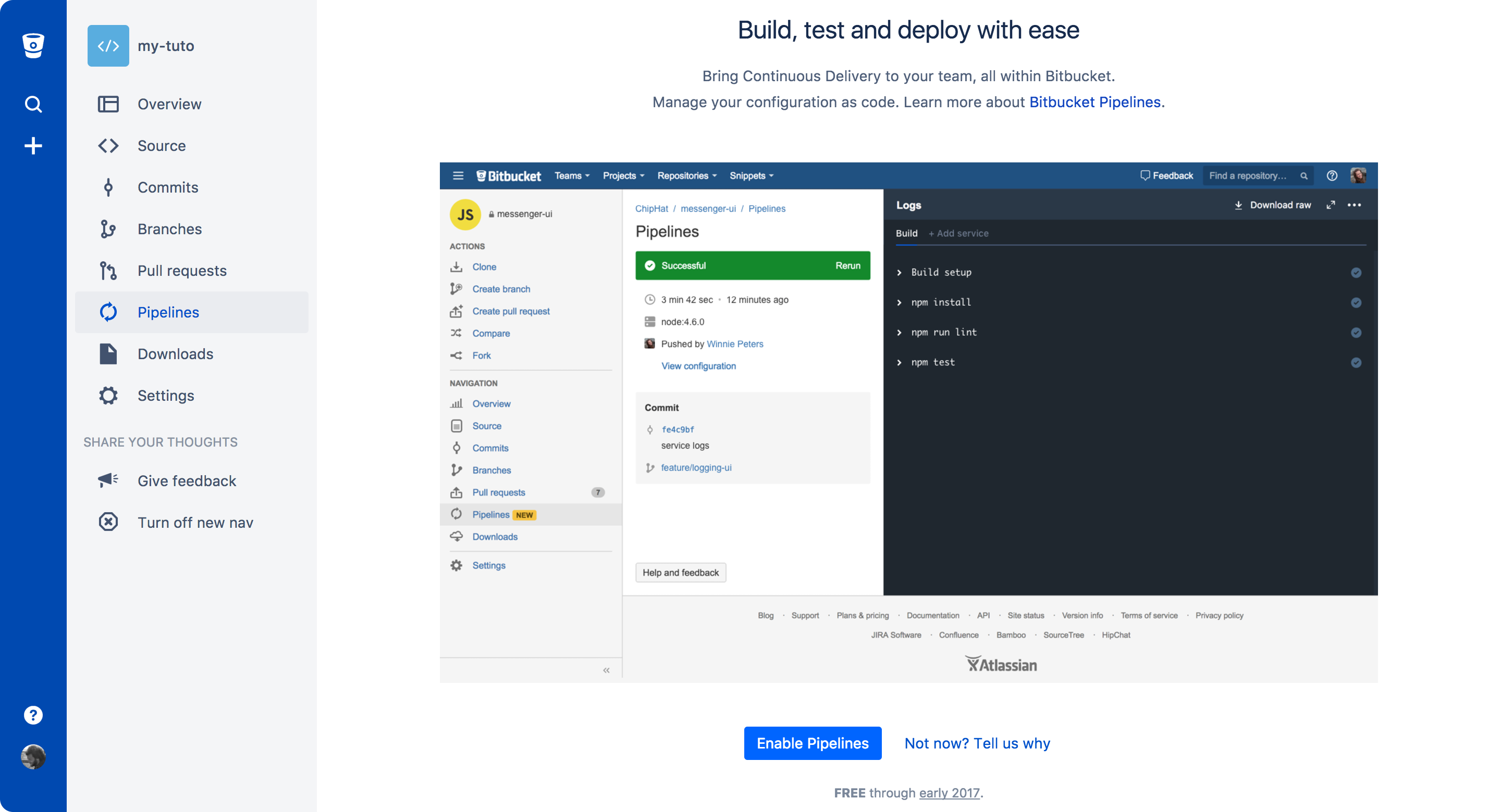 git push -u bitbucket mainline Ve a la sección [Pipelines] del repositorio y habilita [Bitbucket Pipelines].