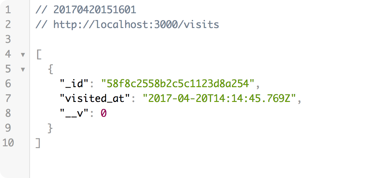 Puedes ir a http://localhost:3000/visits para comprobar que se ha registrado una visita en la base de datos.