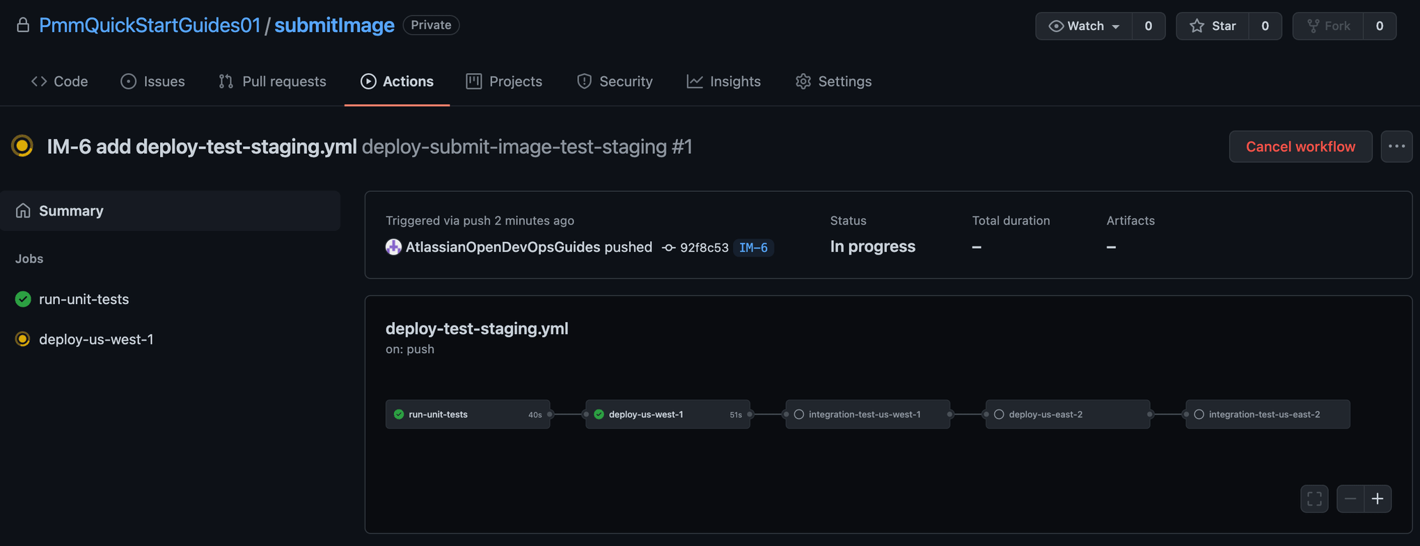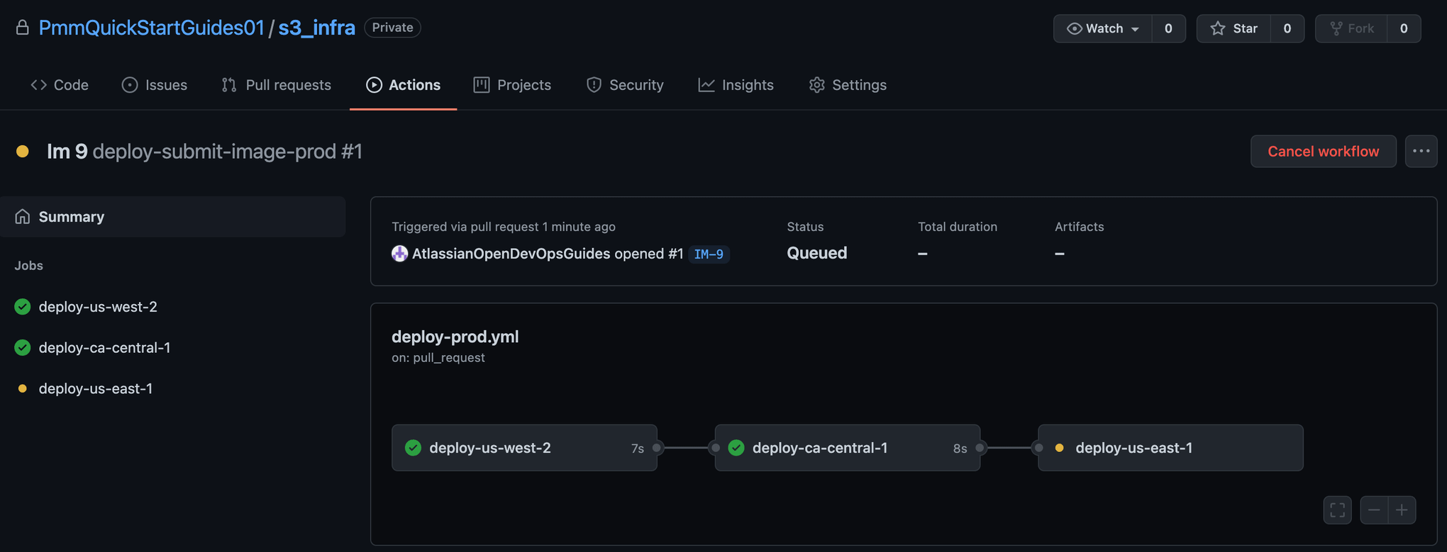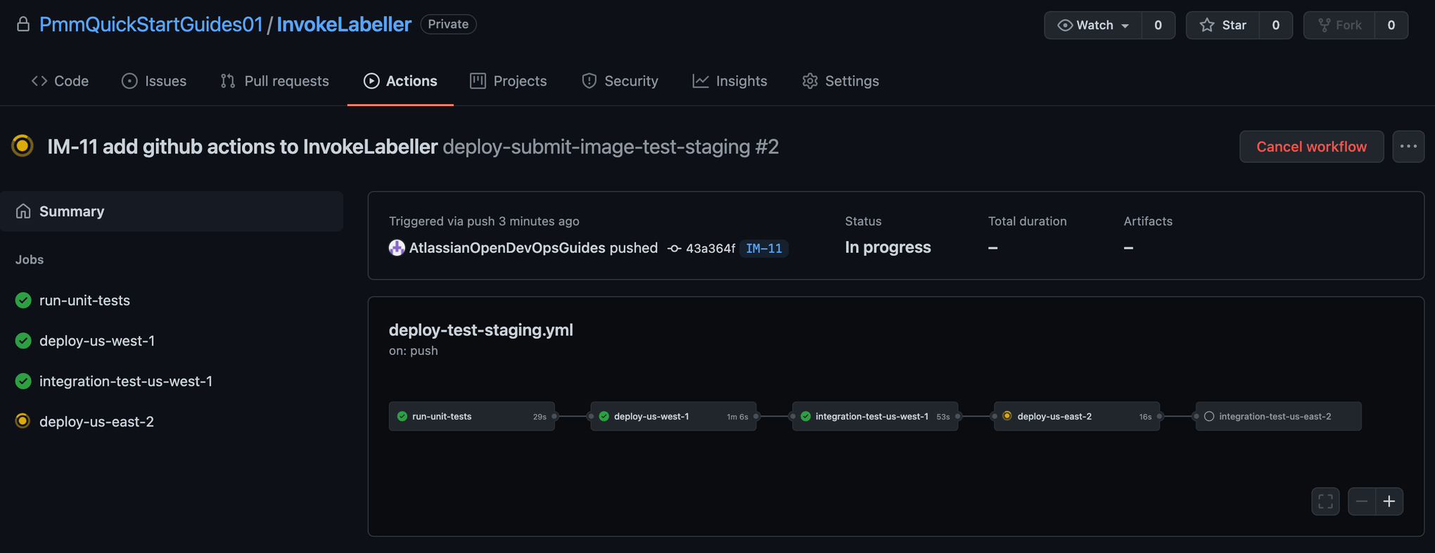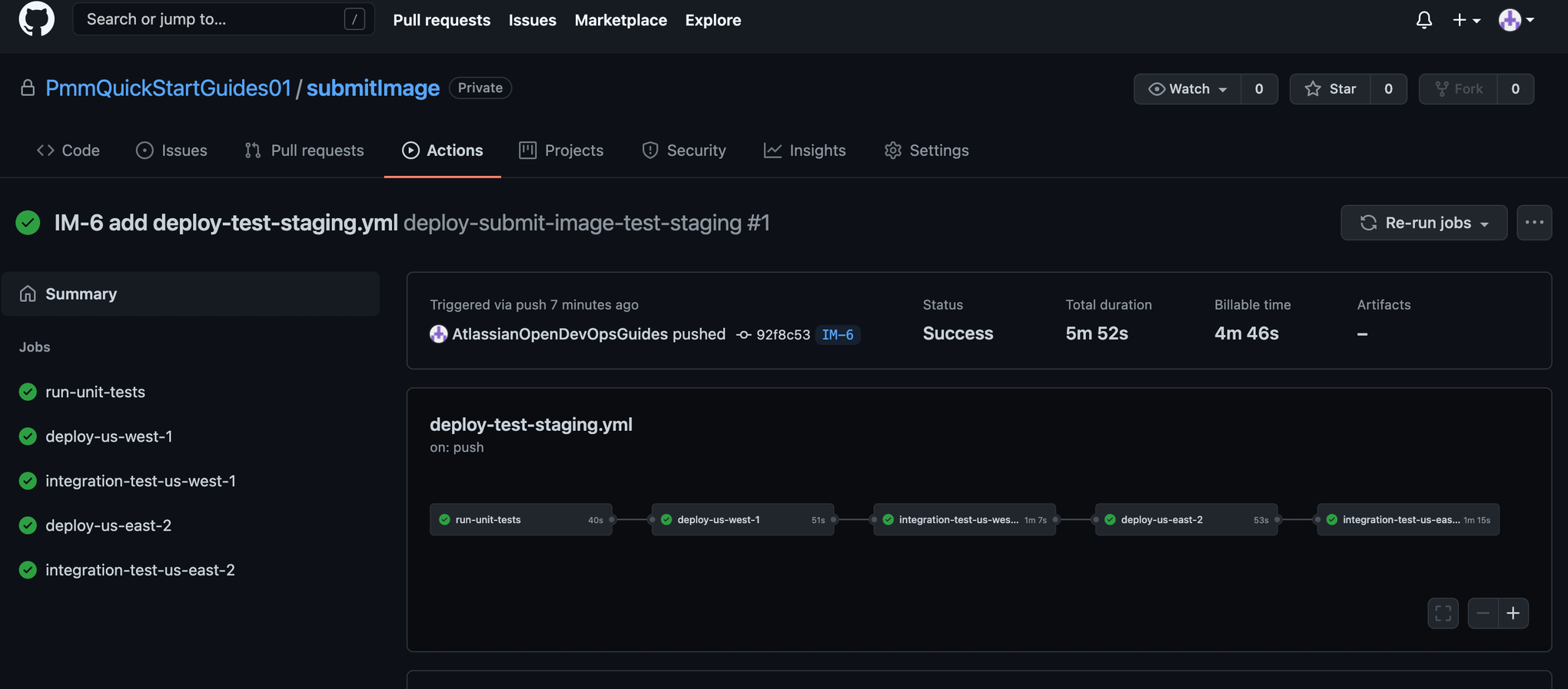 git push -u origin IM-11 Haz clic en Actions (Acciones) para ver los flujos de trabajo en ejecución. Las pruebas del sistema definidas anteriormente se ejecutan como parte de las tareas integration-test-us-west-1 e integration-test-us-east-2.
