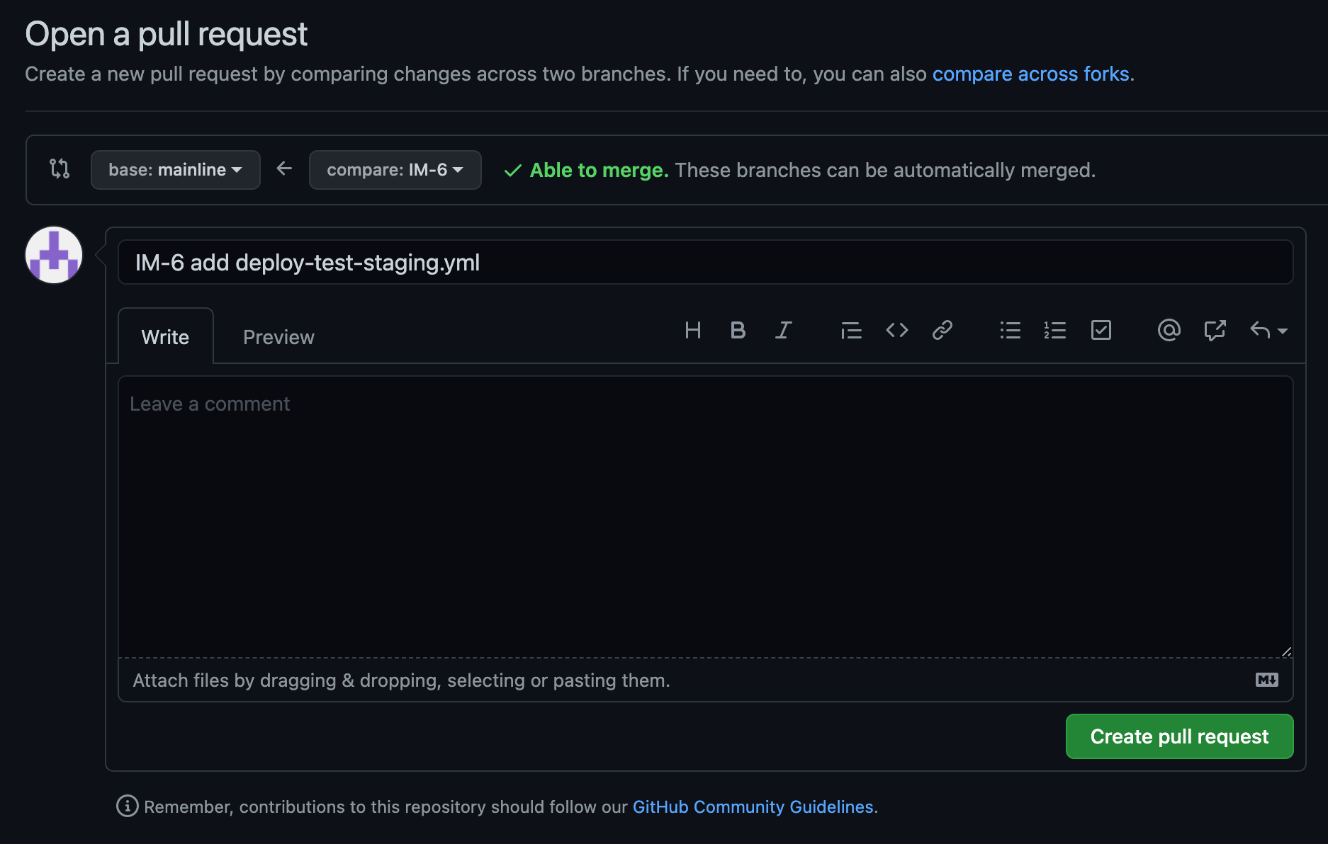 mkdir -p .github/workflows && cd .github/workflows Crea deploy-test-staging.yml con el siguiente yaml en el nuevo directorio .github/workflows . Esto define un flujo de trabajo de implementación para tus entornos de pruebas y ensayo que se ejecuta durante los envíos a ramas distintas de la rama principal.