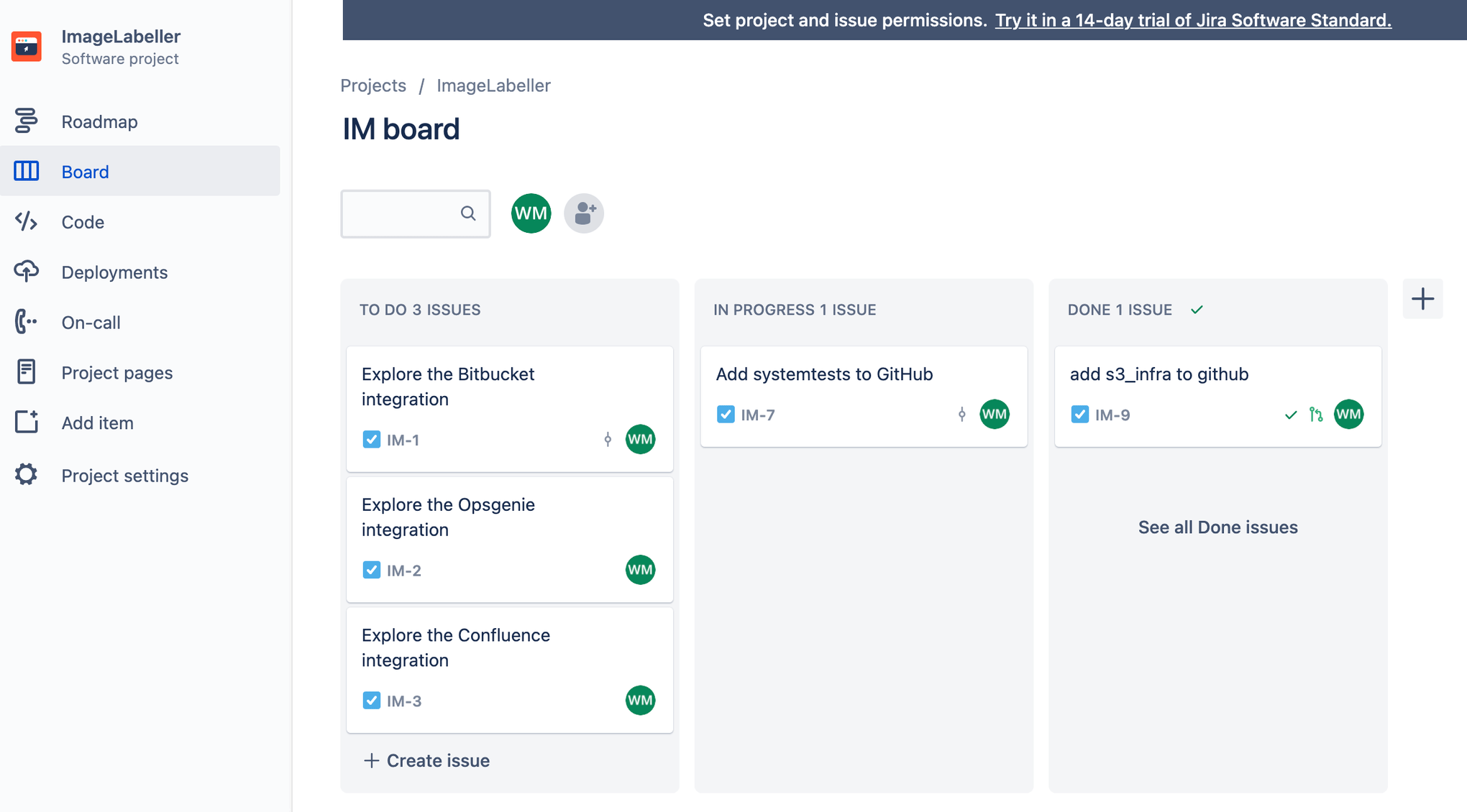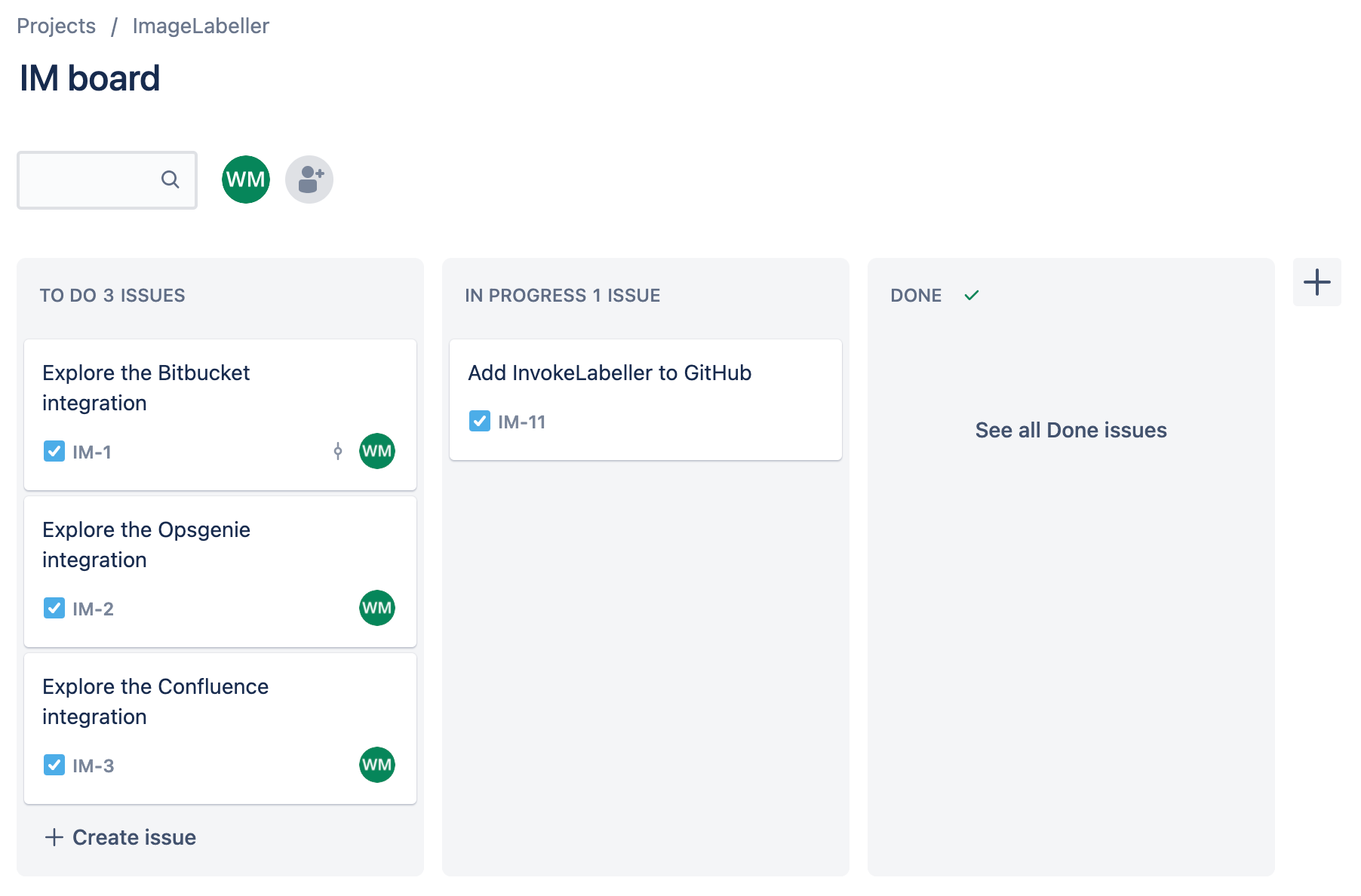 Ve a Jira y crea una incidencia de Jira para añadir un repositorio de la AWS Lambda de InvokeLabeller a GitHub. Toma nota del identificador de la incidencia de Jira. En este ejemplo, es IM-11.