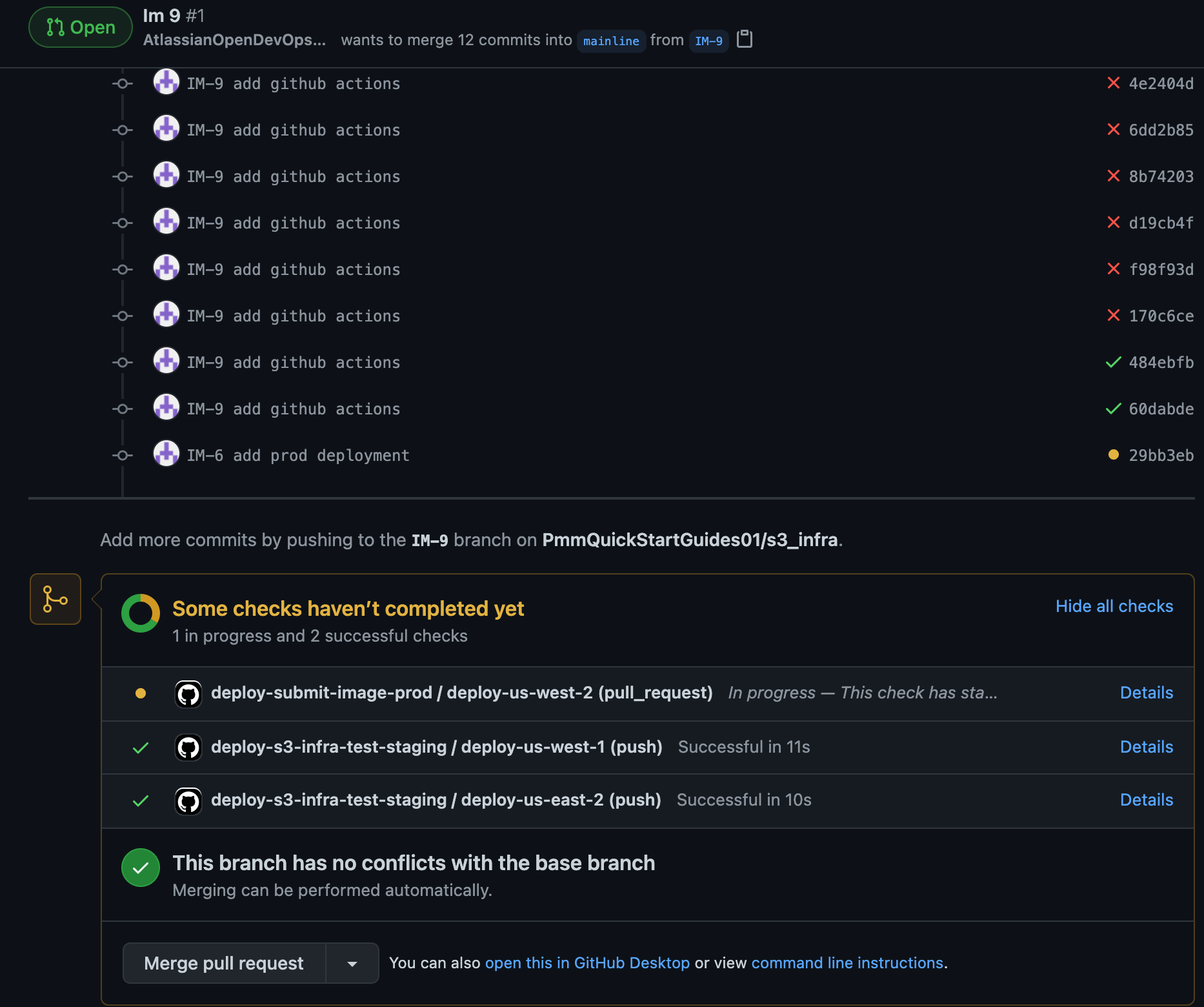 Fusiona la solicitud de incorporación de cambios y elimina la rama de funciones. Haz clic en Actions (Acciones) para monitorizar la implementación del entorno de producción.