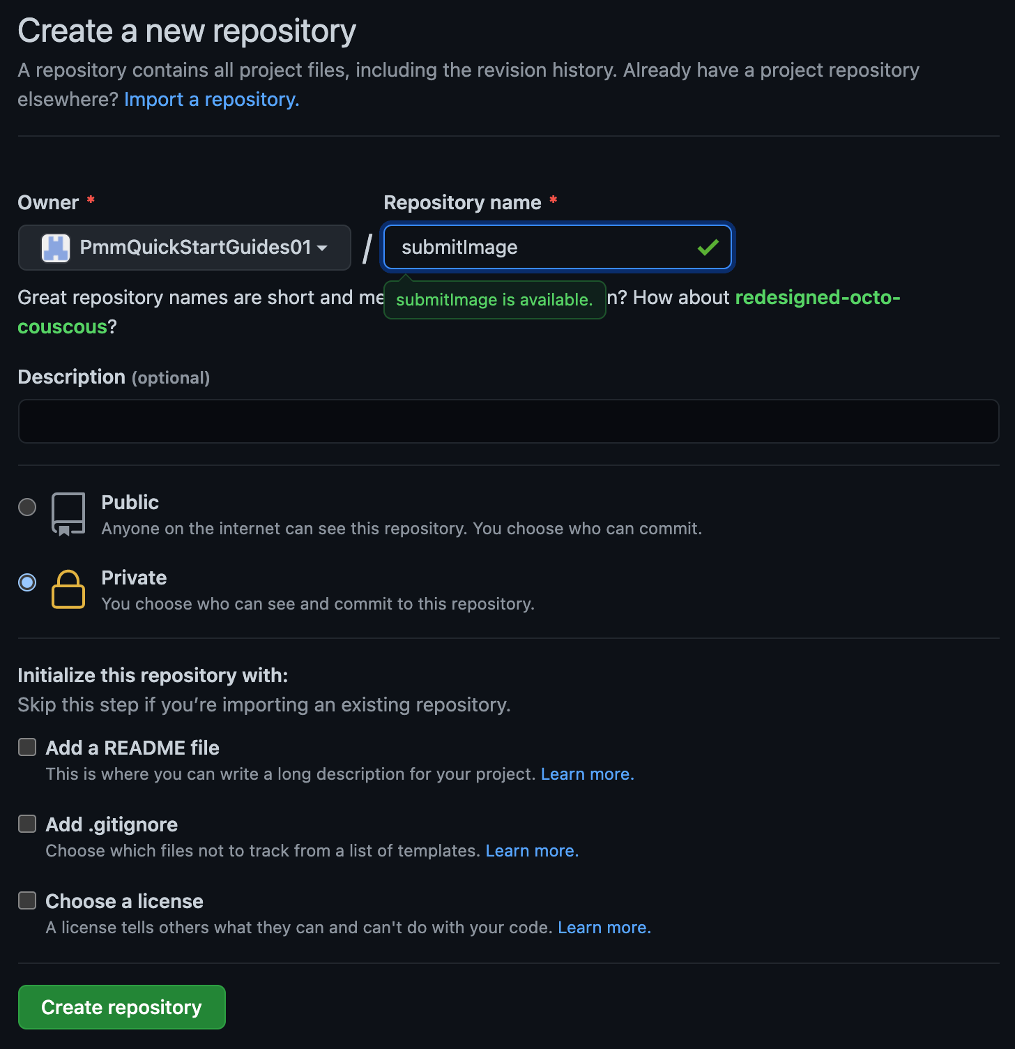 Ve a GitHub y haz clic en New (Nuevo). Elige la organización adecuada para Owner (Propietario). Haz clic en Create Repository (Crear repositorio) para continuar.