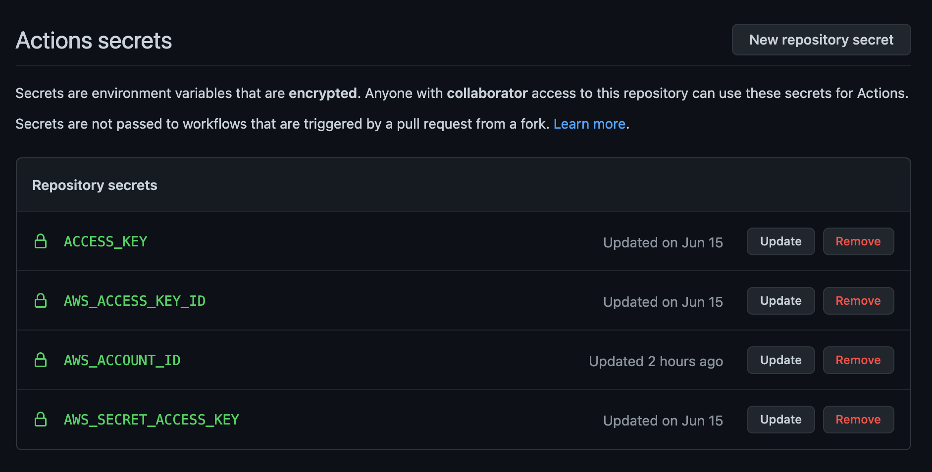 Haz clic en Settings (Configuración) y, a continuación, en Secrets (Secretos). Añade tu token de acceso personal como ACCESS_KEY, el identificador de tu clave de acceso de AWS como AWS_ACCESS_KEY_ID, tu clave de acceso secreta de AWS como AWS_SECRET_ACCESS_KEY y el identificador de tu cuenta de AWS como AWS_ACCOUNT_ID.