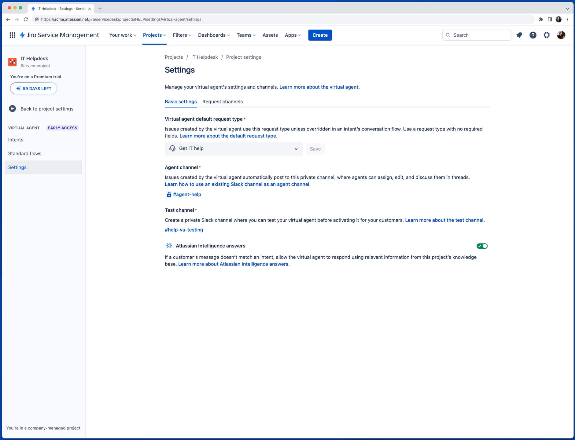 Once you’ve completed the basic virtual service agent setup, AI answers (if enabled) along with any intent flows you’ve switched to “live” will automatically be live in your Jira Service Management customer portal. From there, you have the option to connect the virtual service agent to additional channels by navigating to Project settings > Virtual service agent > Settings > Channels.