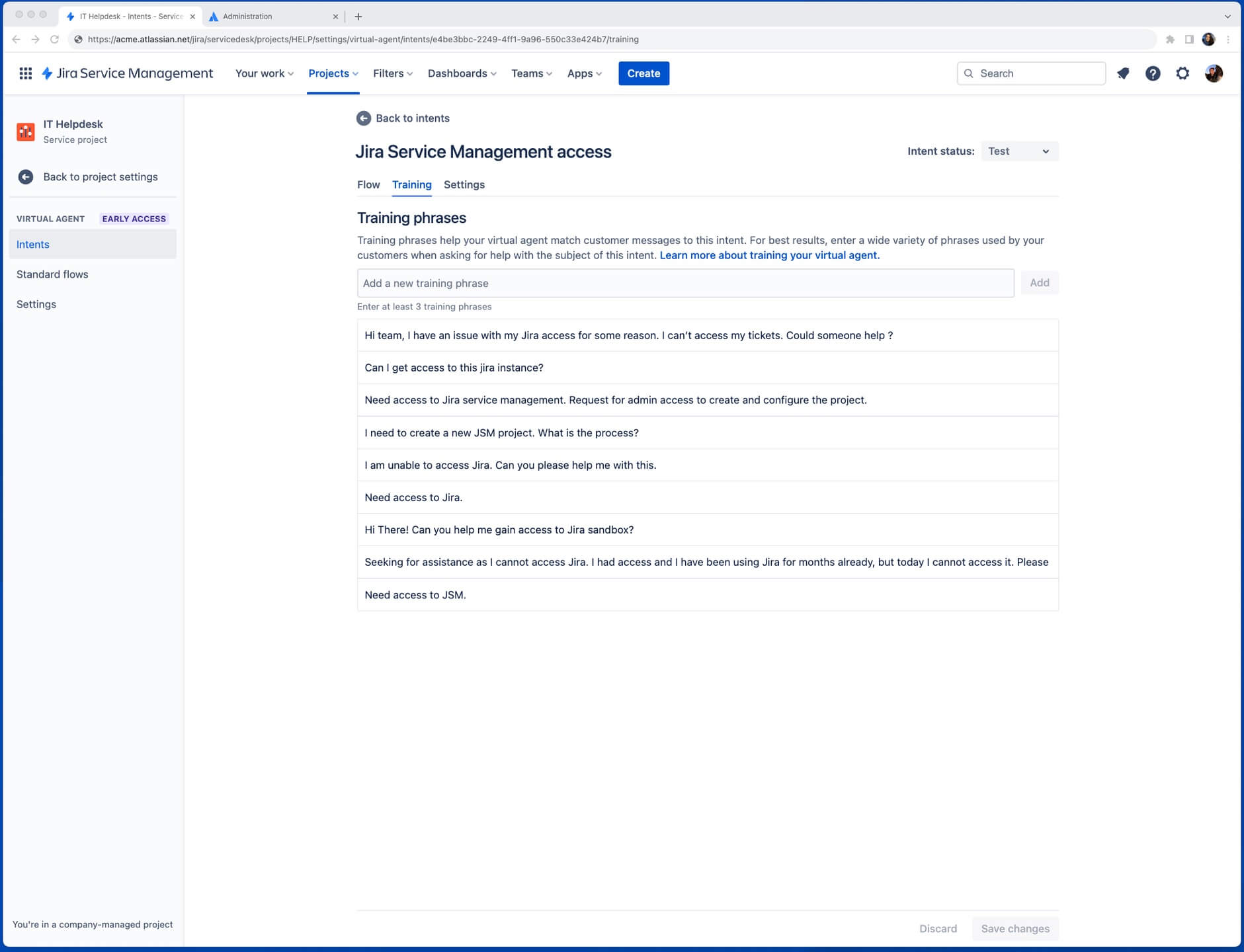 You can test your virtual service agent using the Test option in your virtual service agent settings menu on the left-hand side. This allows you to check training phrase quality, conversation flows, and Atlassian Intelligence answer quality in a testing environment before activating them for customers.